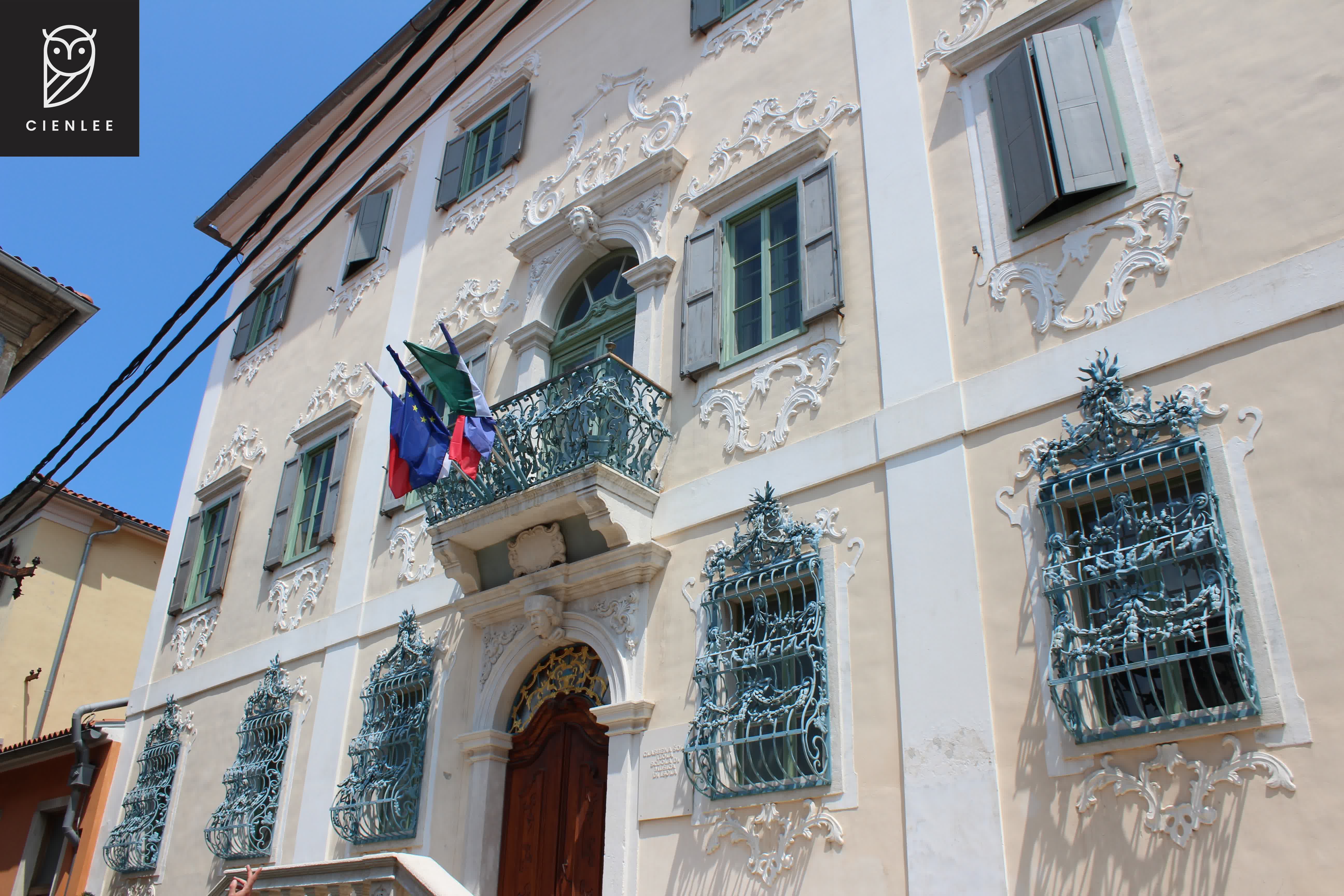 Caminamos por el casco antiguo de influencia veneciana con sus calles estrechas y empedradas en las que pudimos observar edificios históricos. Gracias a las bonitas melodías que escuchábamos, nos detuvimos y encontramos la Escuela de Música de Izola, ubicada en el Palacio Besenghi degli Ughi (Palača Besenghi degli Ughi), de estilo barroco tardío. Es un singular edificio de tres plantas y rejas en color azul y allí permanecimos unos minutos antes de seguir nuestro trayecto. Esta construcción fue encomendada por la acaudalada familia Besenghi de Istria al prestigioso arquitecto Filippo Dongetti en 1775 quien finalizó dicha obra en 1781 y se encuentra actualmente en perfectas condiciones de conservación.