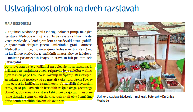 Debajo, se menciona los trabajos realizados por los niños y jóvenes de Quintanar de la Orden a partir de obras literarias eslovenas, siendo exhibidos en Medvode: