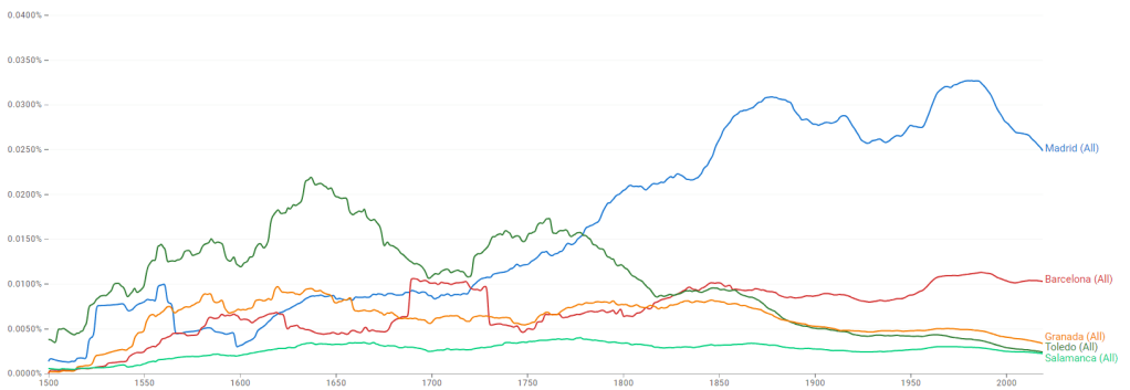 Las ciudades han sido y continúan siendo una fuente inagotable de inspiración para los escritores a lo largo de la historia. En la literatura española, las ciudades desempeñan un papel crucial como escenario, personaje y símbolo. La rica relación entre las ciudades y la literatura española destaca el papel de estas urbes y cómo han influido en la creación literaria, convirtiéndose en un reflejo de la sociedad y la cultura de España. En el gráfico se puede observar la evolución de algunas ciudades españolas en la literatura en castellano en el período 1500-2019.