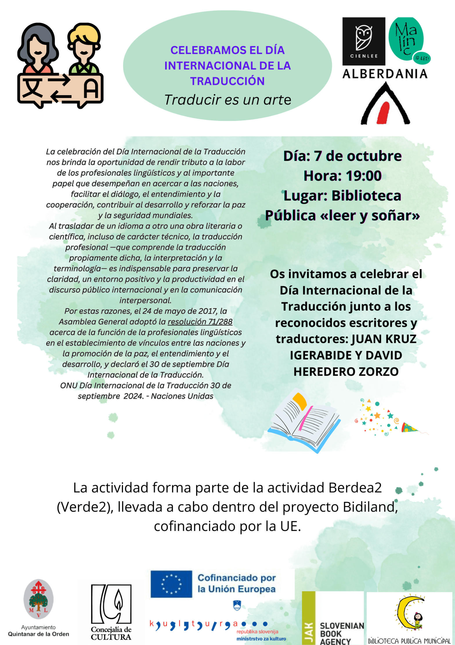 Os invitamos a participar en el encuentro y celebración del Día Internacional de la Traducción junto a los reconocidos escritores y traductores Juan Kruz Igerabide y David Heredero Zorzo.