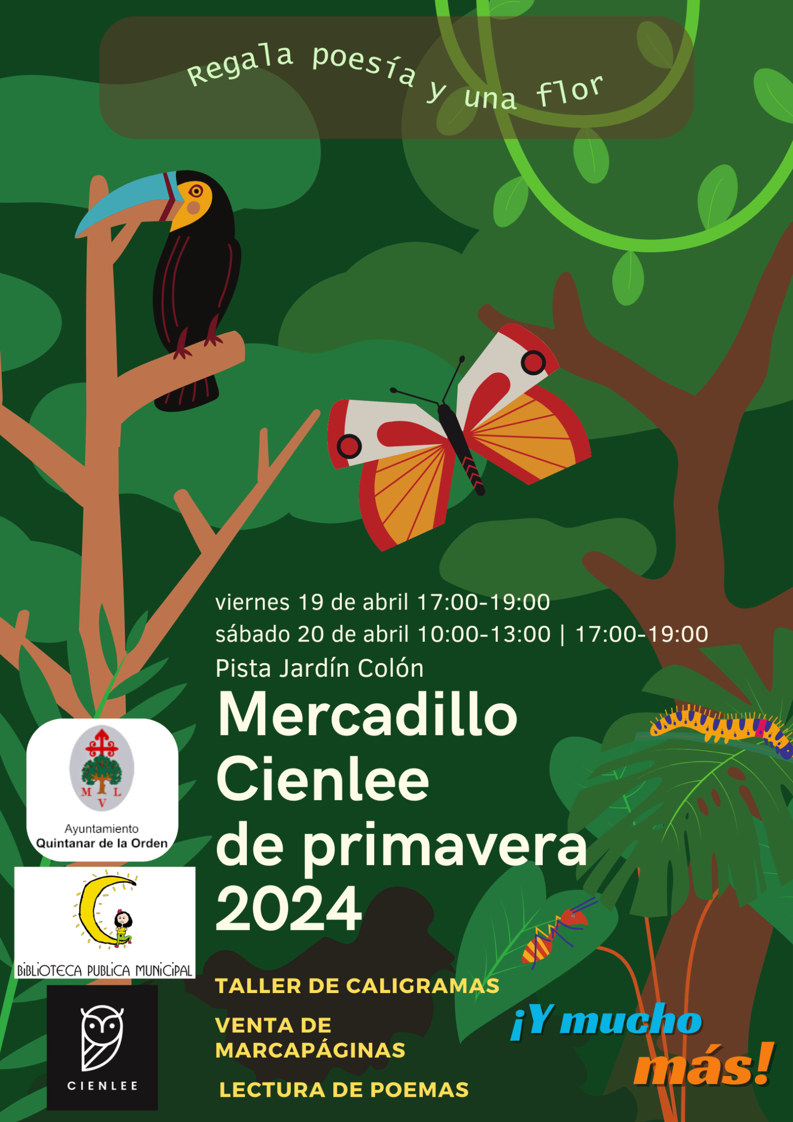 Como todos los años, celebramos nuestro Mercadillo Cienlee de primavera, este año bajo el lema regala poesía y una flor. Os invitamos a disfrutar de momentos de poesía junto a los grupos Cienlee, quienes además estarán impartiendo talleres de caligramas, no te lo puedes perder! ©️ Jacqueline Oliver, 2024 – Todos los derechos reservados