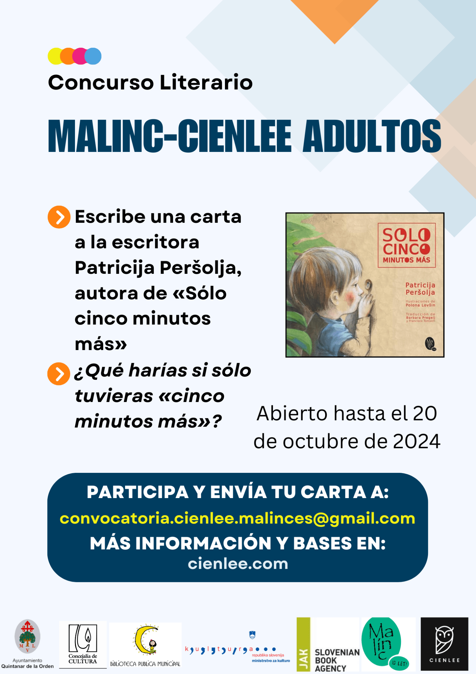 A continuación compartimos con todos ustedes las bases de los diferentes concursos para adultos de América Latina organizados conjuntamente por Cienlee y la editorial eslovena Malinc. Actualmente se lanzan para los siguientes países: Argentina, Chile, Colombia, Ecuador, México, Paraguay, Perú y Uruguay. Pueden consultar las bases para cada país en los siguientes enlaces: